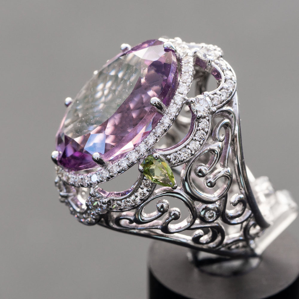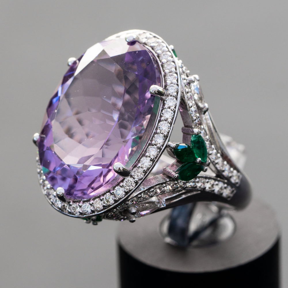 Emani - 20.00 carat natural violet amethyst ring with 1.55 carat natural diamonds and 0.75 carat natural green emerald