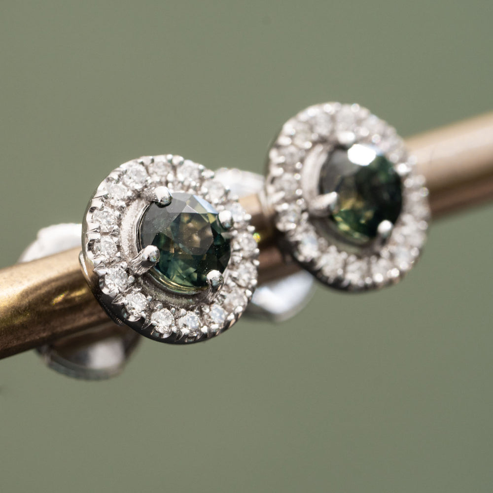 Armande - 0.93 carat round natural bluish green sapphire earrings with 0.30 carat natural diamonds
