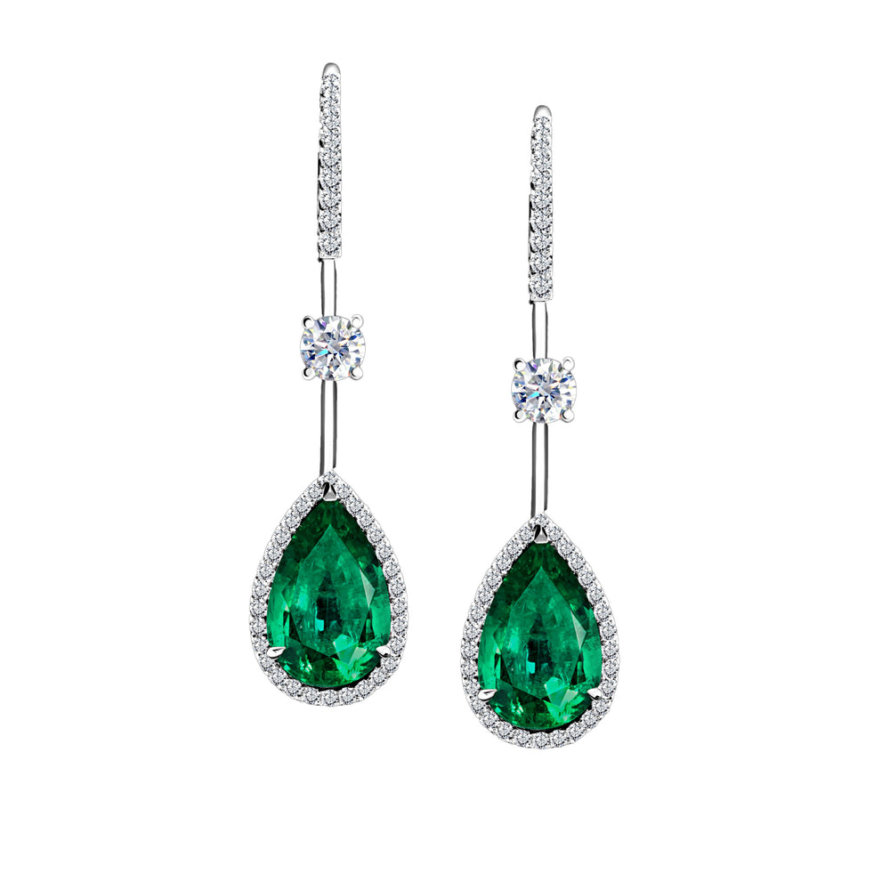 2.16 Carat Pear Shaped Emerald Drop Earrings with 0.53 Carat Natural Diamonds