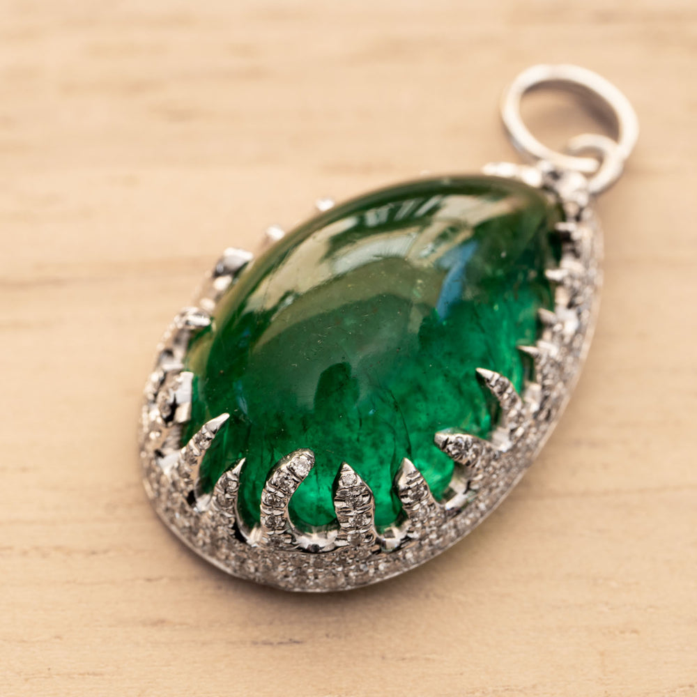 25.60 carat natural green emerald pendant with 0.65 carat natural diamond
