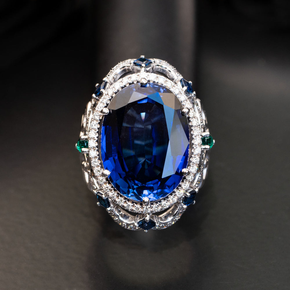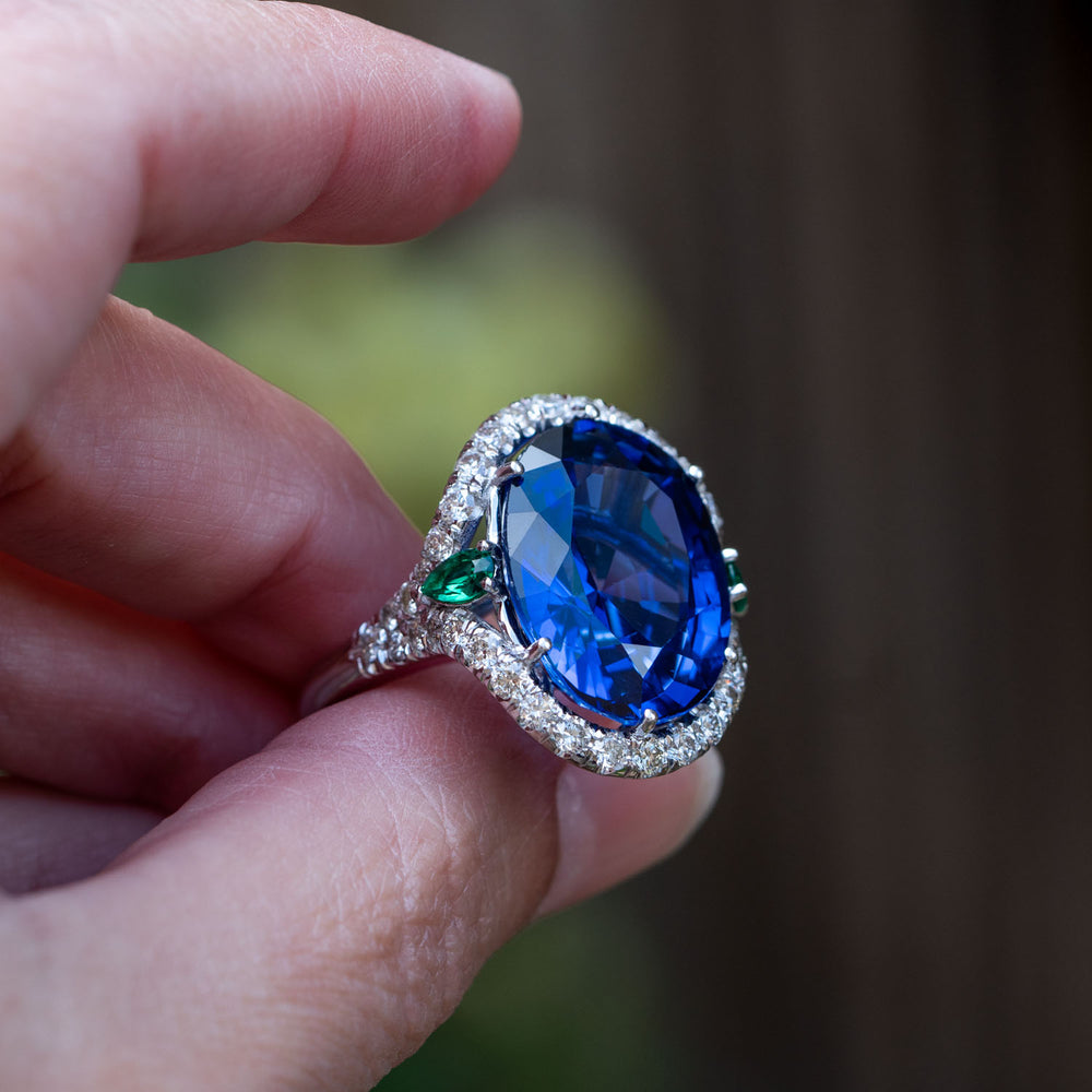 Juliana - 25.00 ct oval sapphire ring with 0.30 natural green emeralds and 1.10 carat natural diamonds