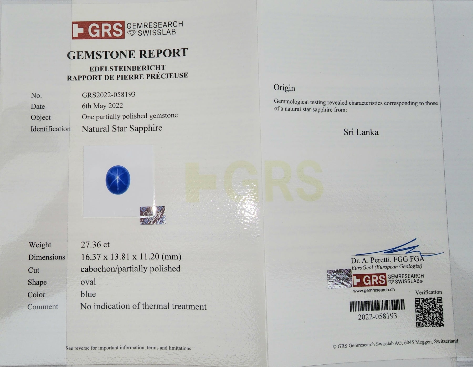 With its deep blue color and captivating star, this sapphire is a true treasure for collectors and enthusiasts. It comes with a GRS certificate, providing further assurance of its quality and value.