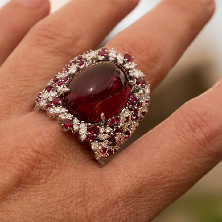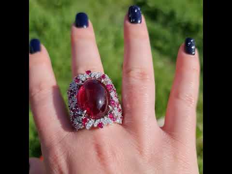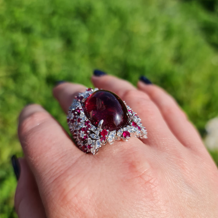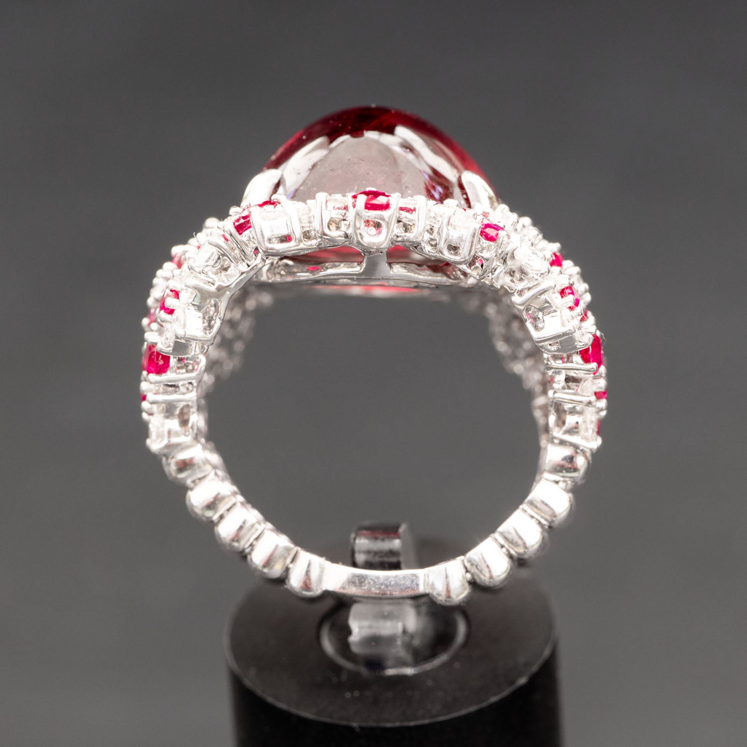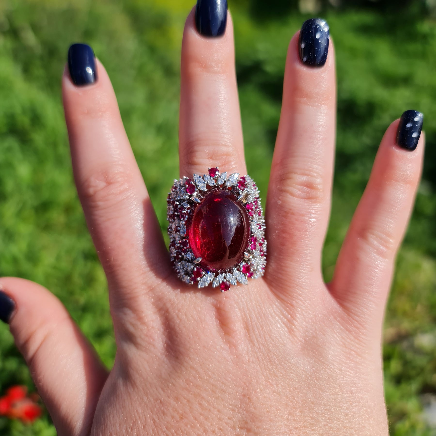 This gorgeous natural rubellite ring will impress everyone around you. It features a large oval 23.52 carat gemstone, adorned with 2.56 carat natural diamonds and 2.60 carat natural ruby. One of a kind