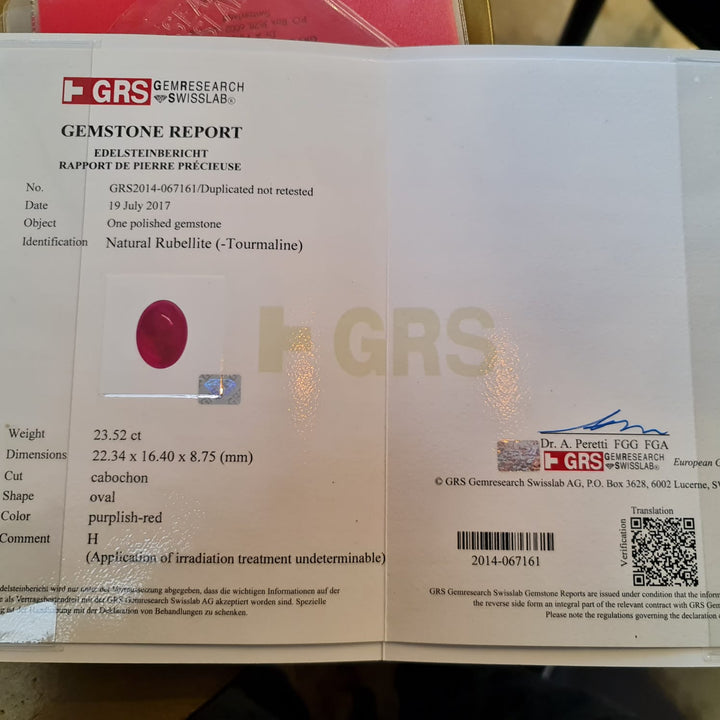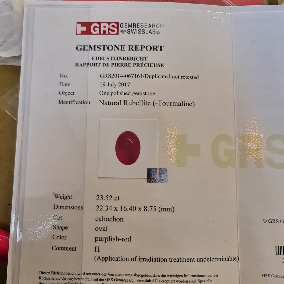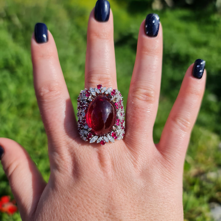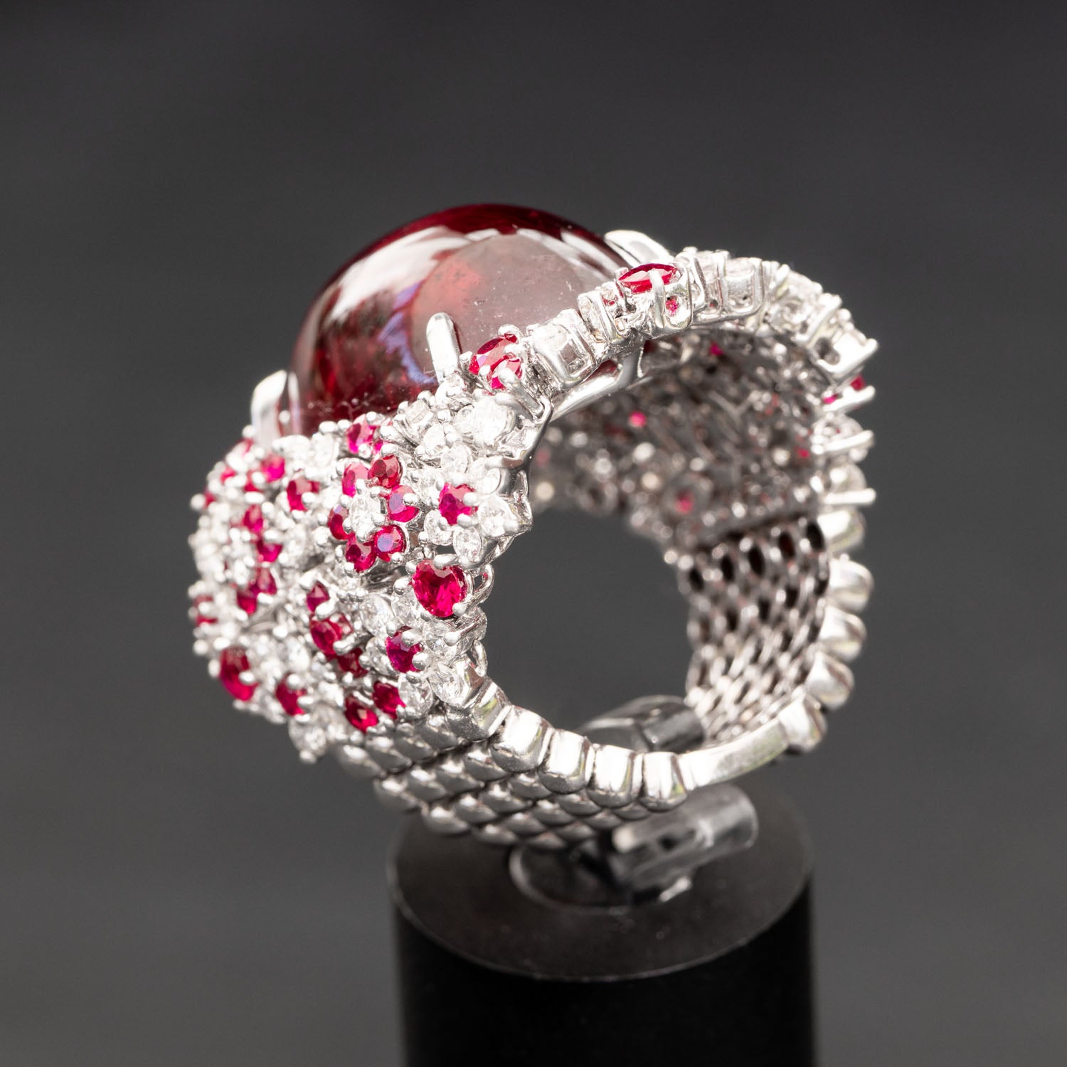 This gorgeous natural rubellite ring will impress everyone around you. It features a large oval 23.52 carat gemstone, adorned with 2.56 carat natural diamonds and 2.60 carat natural ruby. One of a kind
